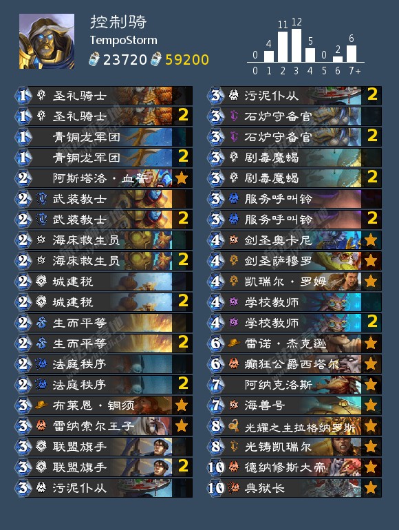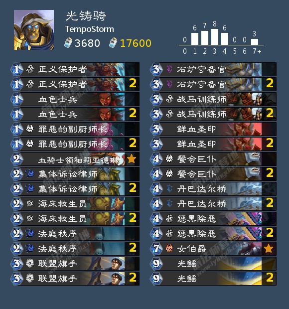 (译者注:我自己的构筑是不带丹巴达尔桥、惩黑除恶、战马训练师的,整体曲线压得很低,但由于天梯的控制卡组在变多,所以孰优孰劣不好判断)