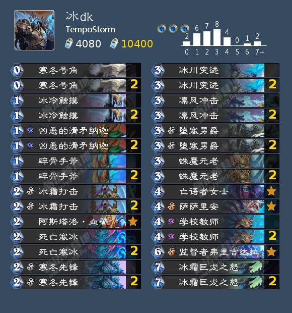 冰dk在当前的天梯中看起来相当不错。它最难应付的对战是拥有大量生命/护甲增益的控制套牌,包括跳费德、血dk和防战。只要这些套牌在你的分段中不占很大一部分,冰dk就是上分的好选择。