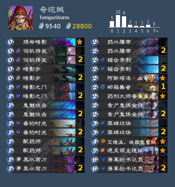 奇迹贼在又一轮平衡变化中幸存下来,但套牌并不像以前那样占主导地位了。对阵快攻法是一场尤其艰难的比赛,因为缺少蛮爪豺狼人,这套牌很难应对早期的小怪。尽管如此,它仍然是天梯上最好的套牌之一,尤其是对于经验丰富的玩家。