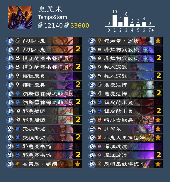 随着奇迹贼在补丁后的人气大幅下降,鬼咒术终于有了喘息的空间。虽然这套牌对阵所有的T1套牌都不好打,但是对其他卡组的优势使得它还是有一战之力的。