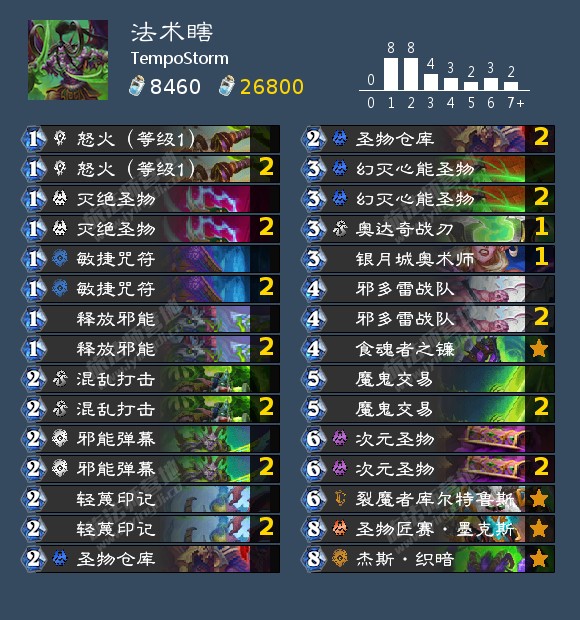 法术瞎目前排在T3。他曾经经历过一些好日子;但现在——首先,圣物组件被削弱了,然后任务线和罪孽烙印也被削弱了。尽管如此,这套牌仍有一些战斗力,但已经不如以前了。这套牌中只能携带3个随从,所以需要用法术来弥补随从的损失。目前,这三个随从分别是银月城奥术师、杰斯·织暗和圣物匠赛·墨克斯。目前这三者是比较固定的,但是有修改的空间。