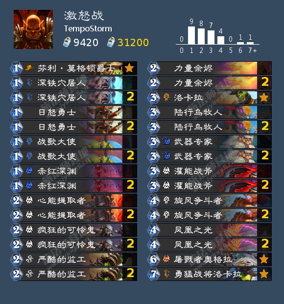 在最新的补丁中,削弱让激怒战的地位有所提升,但玩家仍然不太喜欢这套牌,数据量的过少使得它的地位其实挺难评估的。目前来看这套牌的地位还在提升,但可能会被逐渐回归的奇迹贼再压一头。如果天梯任何分段都有超过1.5%的玩家在玩激怒战,我们觉得才是最吃惊的(译者注:你礼貌吗)。