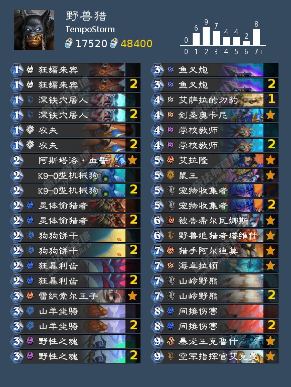 野兽猎目前代替了龙鹰猎成为了猎人活跃的套牌。哮雷龙鹰的削弱已经导致依赖它的套牌难以游玩。野兽猎的表现更好,因此我们将其排到了T3的位置。