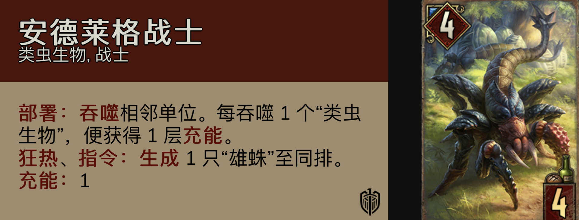 安德莱格战士:一般叫双吞,整套卡组除了蟹蜘蛛就只有这两张落地吞,除了吞遗愿也能在红龙站场的情况下减少自己的单位,有时候也能生小蜘蛛避免红龙烧到其他的单位。