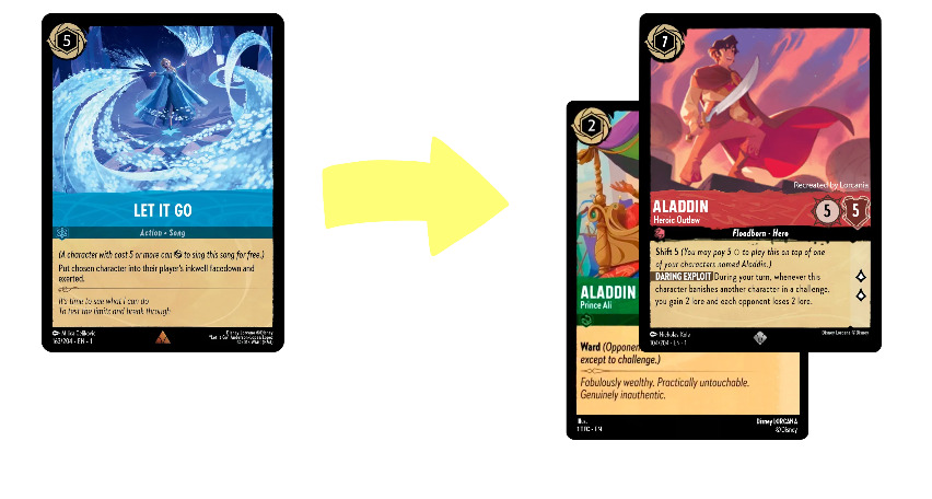 Q:转换角色之下的牌处于什么状态?例如LET IT GO对阿拉丁-英勇的亡命之徒使用,下面的阿拉丁-阿里王子会怎样?是一同进入墨水池还是只有最上面的牌进入墨水池?若是被弹回手牌呢?