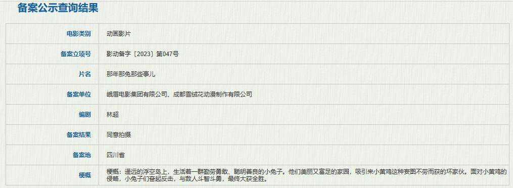 根据国家电影局关于2023年5月上全国电影剧本备案、立项公示的通知,动画影片《那年那兔那些事儿》已通过拍摄备案申请。