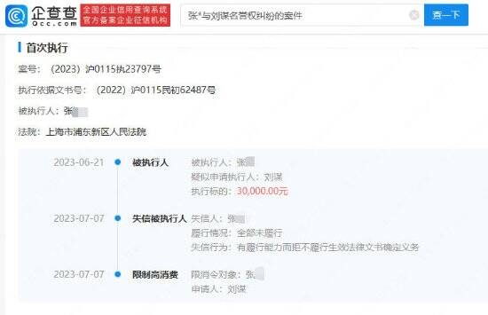 企查查APP显示,近日,张某因有履行能力而拒不履行生效法律文书确定义务被列为失信被执行人(老赖)。