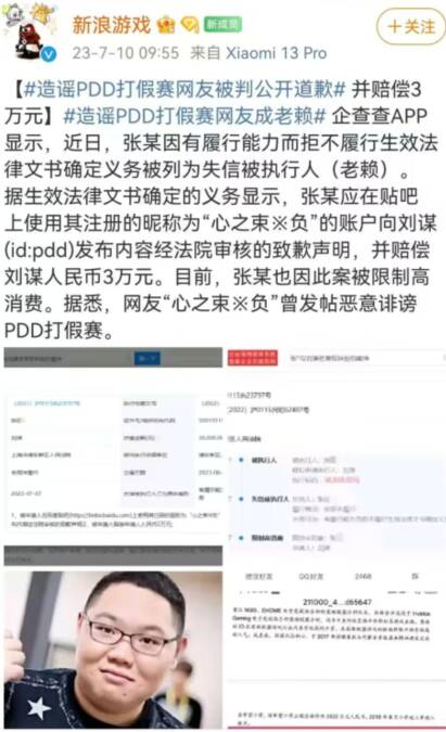 据生效法律文书确定的义务显示,张某应在贴吧上使用其注册的昵称为“心之束※负”的账户向刘谋(id:pdd)发布内容经法院审核的致歉声明,并赔偿刘谋人民币3万元。目前,张某也因此案被限制高消费。据悉,网友“心之束※负”曾发帖恶意诽谤PDD打假赛。