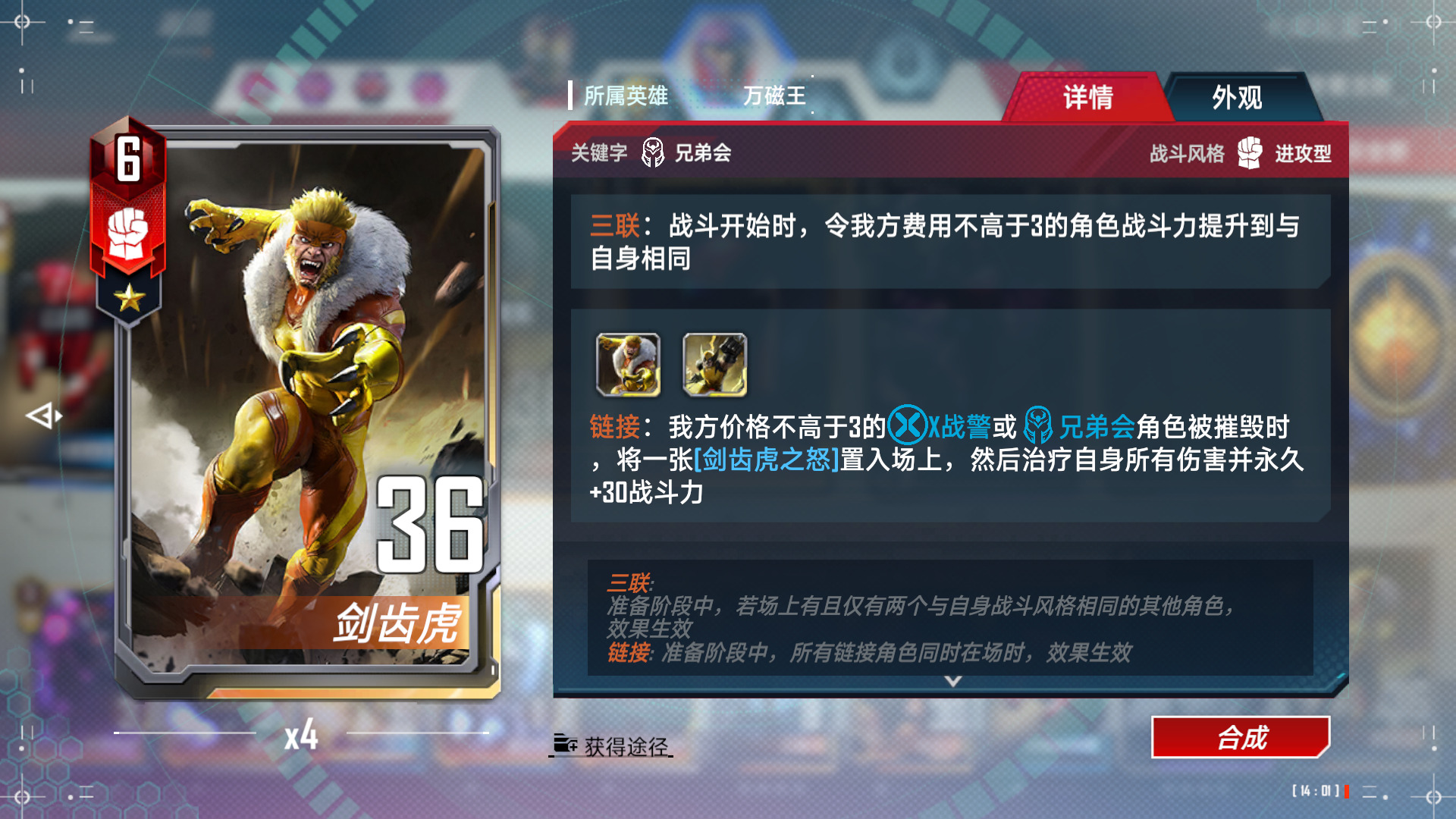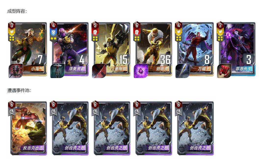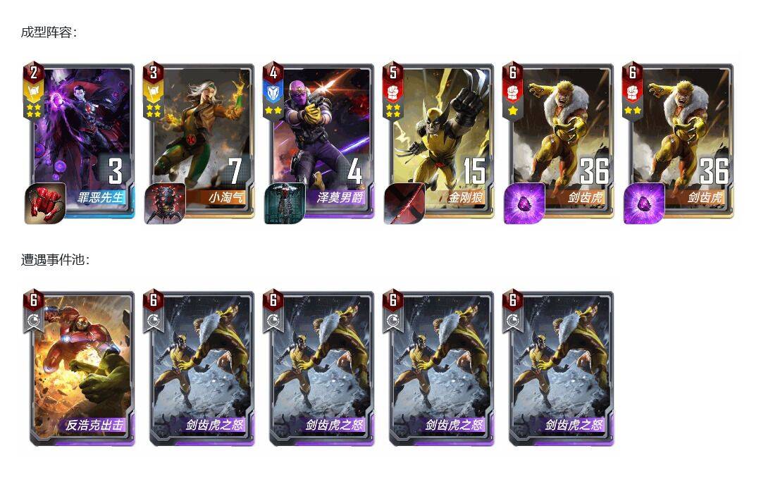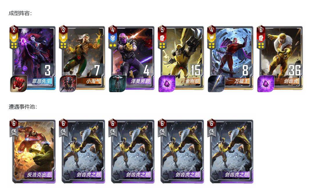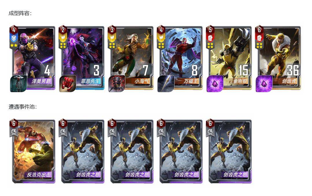 开始测试阶段我没有带泽莫,带了突击神盾局,但是发现无论是牛牛还是蜘蛛格温阵容,现在都开始带姆巴库了,所以一个突击并不管用。主要还是需要剑齿虎的连续出拳去解掉大型幻象。所以可以上场两个剑齿虎放到后排去出拳解掉幻象。同时大家不要忽视了万磁王的三联效果,连续触发的“”磁场能量“”关键字可是2费的兄弟会,可想而知。剑齿虎的战力增长基本可以顶掉几次高攻、闪击、幻象牛的打击,剩下的全看命了,除非对面手里攥着3张轨迹幻象