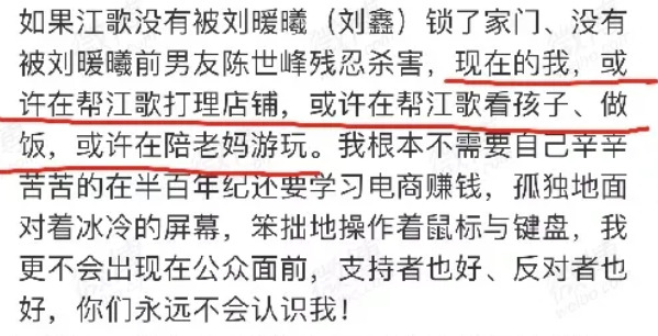 啊?咱真的不太相信呢.......咱猜测啊,其实还是为了赚钱,毕竟她家刚刚赔偿了近七十万,而因案件臭了名声,这家子的经济收入大概也并不健康,像刘鑫就一直未能找到工作,甚至专门改名叫刘暖曦。所以她来带货,想必就是希望吃人血馒头,凭借案件带来的热度变现。