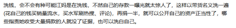 当然,有些网友对此也有针对性观点,认为搞带货的目的就是为了给善款打掩护,好令江母可以合法消费那几亿.......