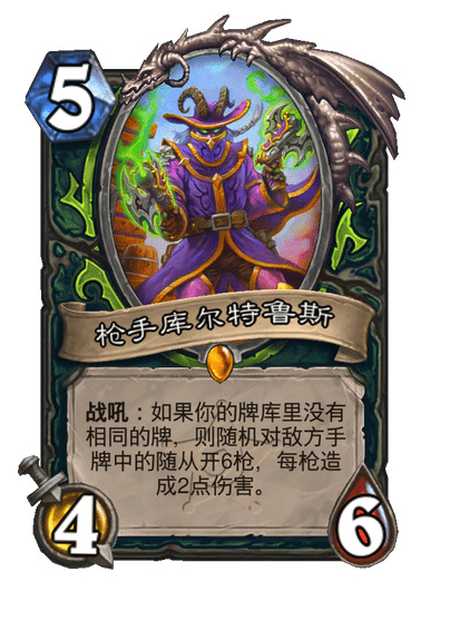 :如果你的牌库里没有相同的牌,则随机对敌方手牌中的随从开6枪,每枪造成2点伤害。