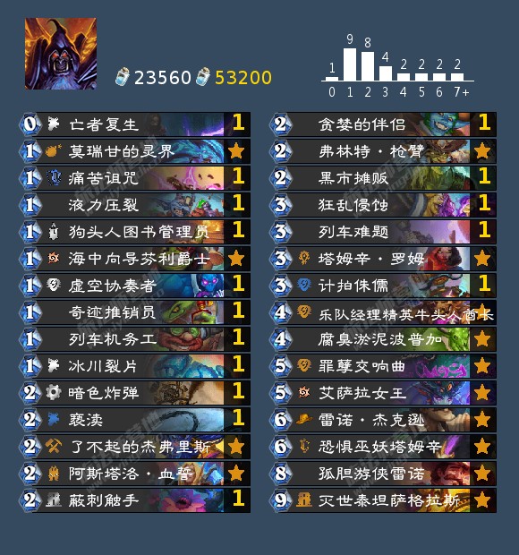 可以看到5费及以上的牌只有6张,而2费以下的牌达到了惊人的18张,大幅度降低卡组曲线使得这套卡组更偏向于jjc卡组按费拍怪,其核心思路便是在4费前拿到场面优势,俗称控场,在4-6费时我们的前期随从的质量已经逐渐跟不上了,此时正好进入我们的乐章/艾萨拉节奏,达到第一次变速,通过乐章和艾萨拉的高质量卡来支撑中期节奏,颇有力代天才蛋魔块术的味道,在7-10费阶段刚好进入雷诺/泰坦和疲劳otk的斩杀阶段,达到第二次变速,最终依靠着泰坦和乐章的质量来拼厚度,依靠艾萨拉和疲劳otk来提速斩杀。