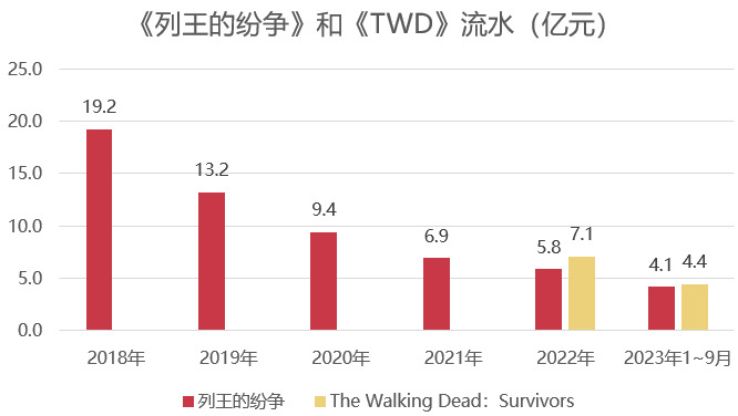 自2020年以来就再没有突破20亿的量级。唯一一次稍有起色的是在2021年,当年推出的新品SLG《The Walking Dead: Survivors(简称为TWD)》提供了增量。但下滑的趋势未曾止住,从今年前三季度的表现来看,这一趋势仍会延续。