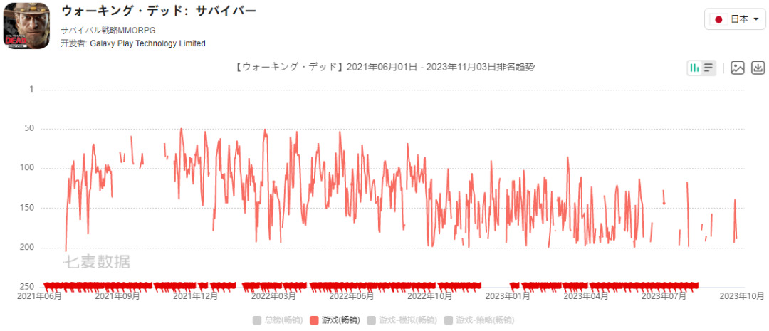 相较于以往的SLG产品,《TWD》已经得到足够多的重视,智明星通罕见地为其制作了日服版本。但至今,《TWD》的巅峰时期仍表现平平,在美国iOS畅销榜100~200名之间、日本畅销榜50~200名之间,均维持了一年之后便出现了下滑。