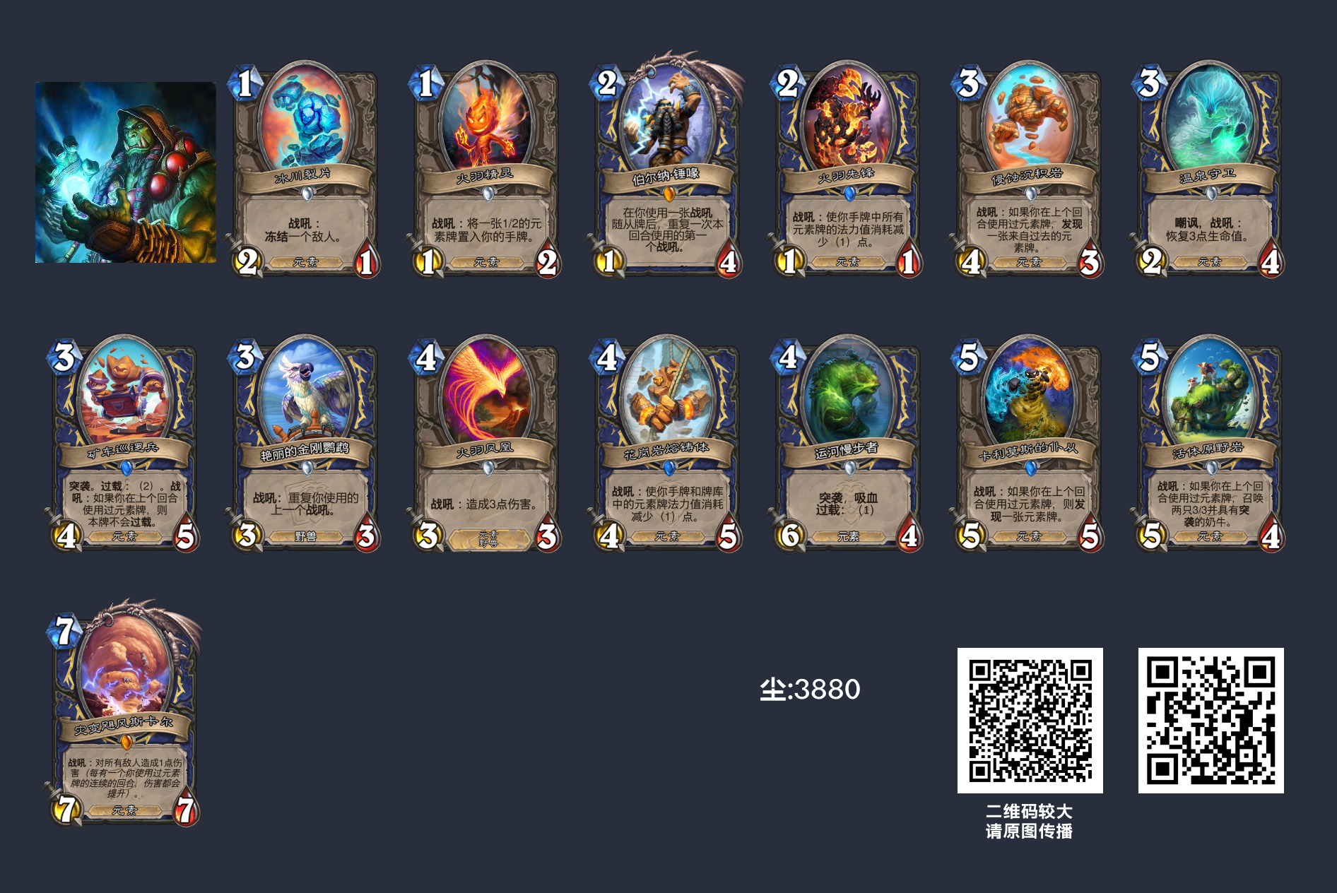 贫瘠之地版本,元素萨再度登场,那个版本的元素以节奏快攻为主,在原初地下城历险家的协助下,整合打脸体系成为T1卡组。