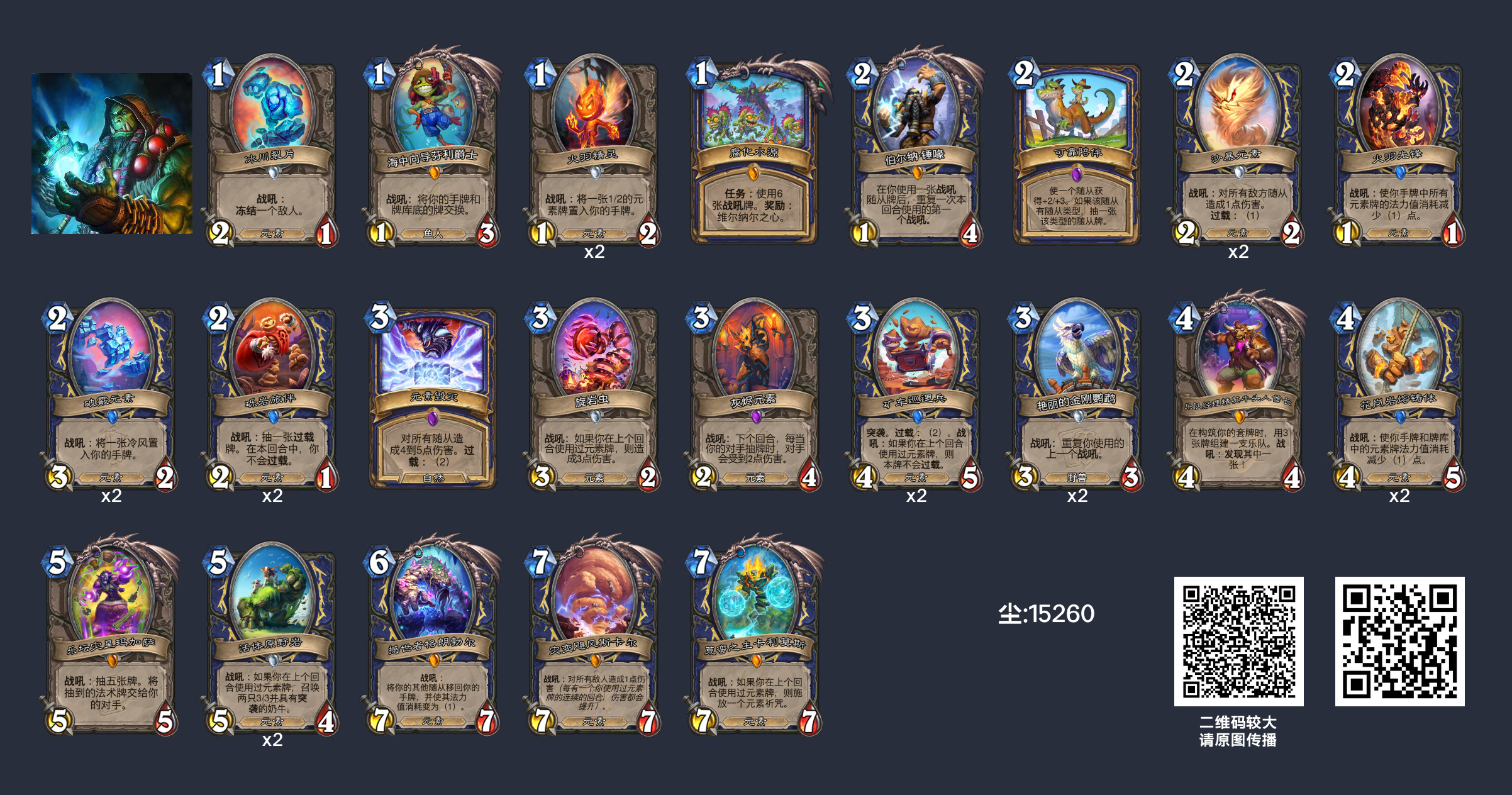 在不考虑宇宙后,加入上面这些元素链牌,大概就有16-18张了,还需要一些元素牌来润滑,更重要的是补充二费曲线(1费任务,2费总不能空过吧)