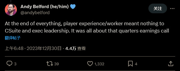 最后,Andy 总结道:“说到底,玩家体验/员工对于CSuite和执行领导层毫无价值。一切都是关于那个季度的财报会议。”