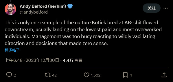 他称这“只是考迪克在动视暴雪培育的文化的其中一个例子”,表示这是“屎从上头顺流而下,往往落在工资最低干活最多的人身上”,然而“管理层则忙于对剧烈摇摆的方向和毫无意义的决策做出反应”。