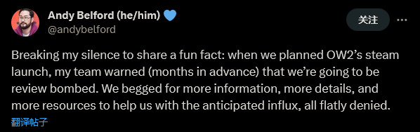 Andy Belford 表示自己终于可以打破沉默,并想要分享一些“有趣”的事实。他写道:“当我们计划《守望先锋2》的 Steam 版发布时,我的团队(提前几个月)警告说我们将收到评论轰炸。我们请求提供更多信息、更多细节和更多资源来帮助我们应对预期的人潮,但都被断然拒绝。”