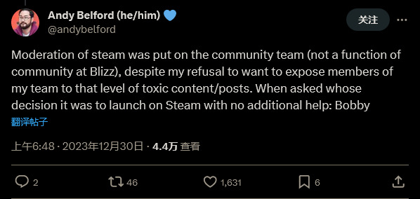 在他离开公司后,一些人终于能公开批评他了,其中就包括前《守望先锋》社区管理Andy Belford。