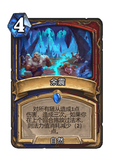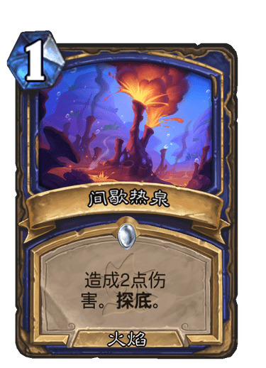 4)间歇热泉,可以解对面2血随从,不过它的最大价值是探底发现下回合要用的关键牌,如先祖召唤,余震,各种大哥等。这里需要注意的是,间歇热泉有2张,使用第一张后记住另外两张是什么,这样当第二张上手后,我们相当于手中有了一个一费的牛牛,超模到姥姥家了有没有。