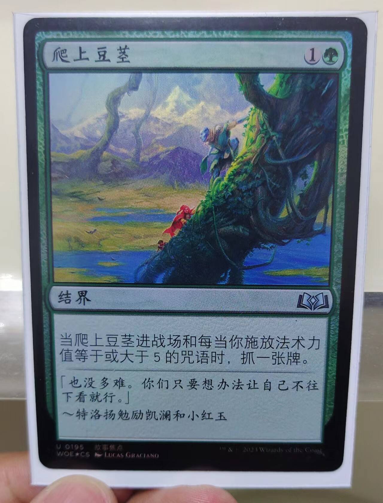 备牌局换备方面和打猫老爷时的换备相同,当我感觉优势在我的时候,战报开头说的伏笔开始回收了,我套牌中的爬上豆茎是3张平、1张闪,我在赛前准备的时候只是将变弯严重的几张牌救了一下,没有处理套牌中其他的闪牌,在备牌局中,我抓到了当天第一次出现的闪爬上豆茎,但在我下豆茎后,围观的人指出,我的这张豆茎不平,有做牌嫌疑,并叫了裁判,我当时大脑嗡的一下,蒙了。我从没想过会出现这种情况,也从没想过竞争级比赛会这么严。当然,还是因为我参加这种级别比赛的经验太少了,没有把这个当回事。裁判来了之后也觉得我这个牌有点弯,但这时卜奕大师很友善的原谅了这件事,没有向裁判提出对我进行严厉处罚,裁判只是让我换了一张代牌,代替掉这张有些弯的爬上豆茎,然后继续了比赛,谢谢卜奕大师的谅解。不过这件事还是导致我在这局后续的比赛中大脑全程处于蒙比状态,当卜奕大师说释放3费戮日者格莉莎的时候,我喊了响应,然后闪现出地脉束缚,但此时戮日者格莉莎还在堆叠里我的地脉束缚没有目标,只能扣掉对方的深窟蝙蝠,真是巨大犯包,这导致格莉莎登场后直接大开杀戒,后续几个回合把我的结界全杀了,直接落败。