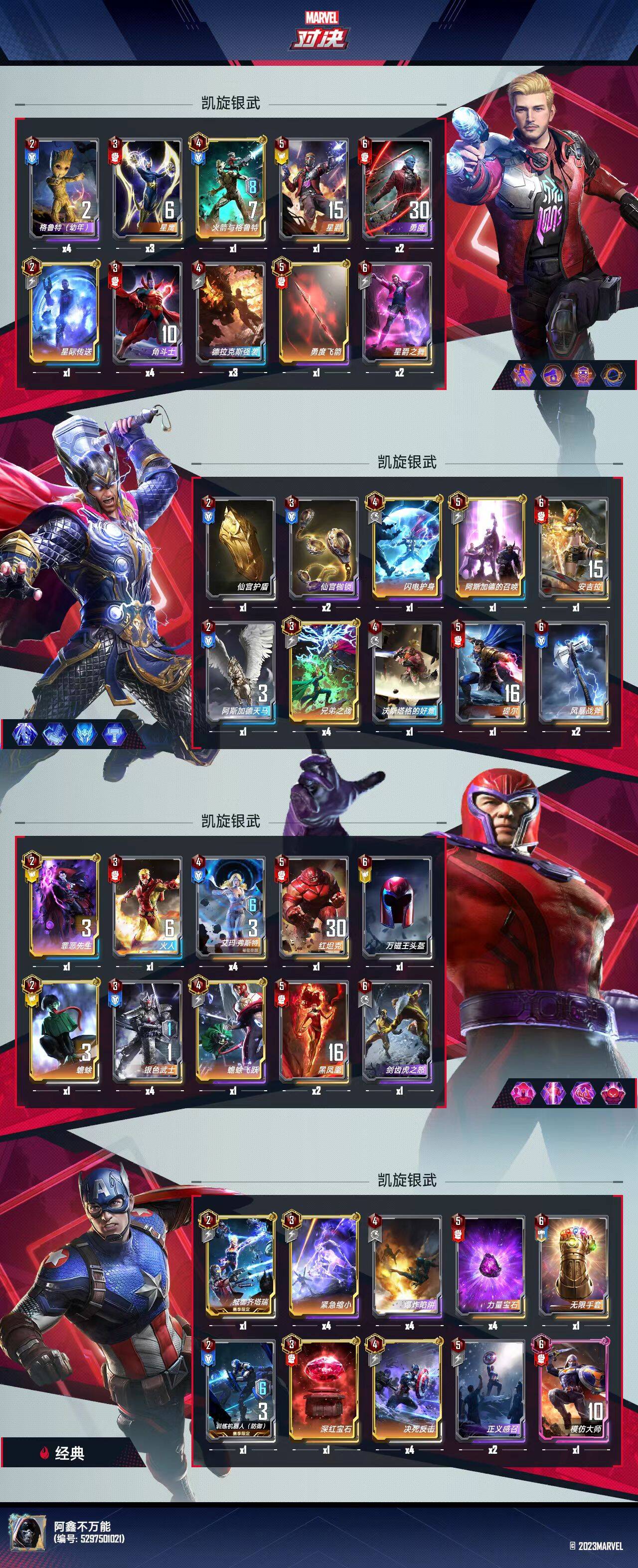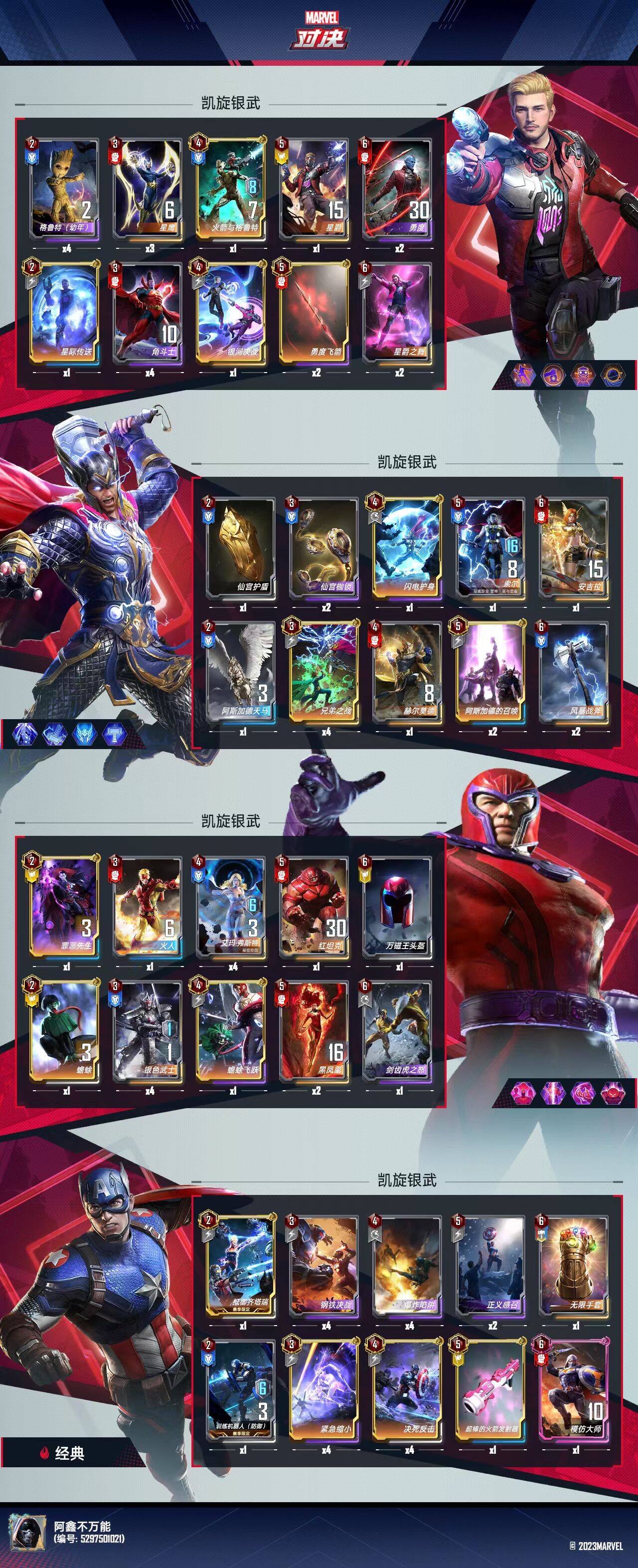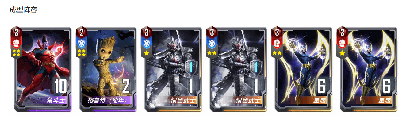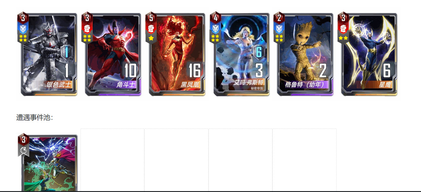 思路就是卡3,通过不断打出星爵和事件卡,增加格鲁特身材,如果输了,银武回手,增加身材,大概持续到7回合左右,当银武4星后升5本,找黑凤凰,不过应该到不了这个时候把,本卡组主要是前期快速入血,后期较为乏力,需要靠黑凤凰的摧毁才行,但是这套玩的就是没有后期。