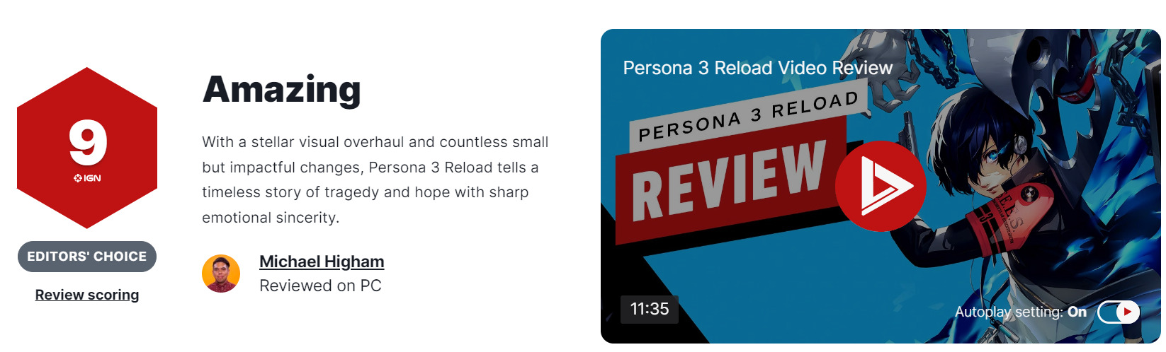IGN编辑为即将发售的《女神异闻录3:Reload》打出了9分的好评,认为该作因其改动和提升光彩绽放,是值得游玩的复刻版。