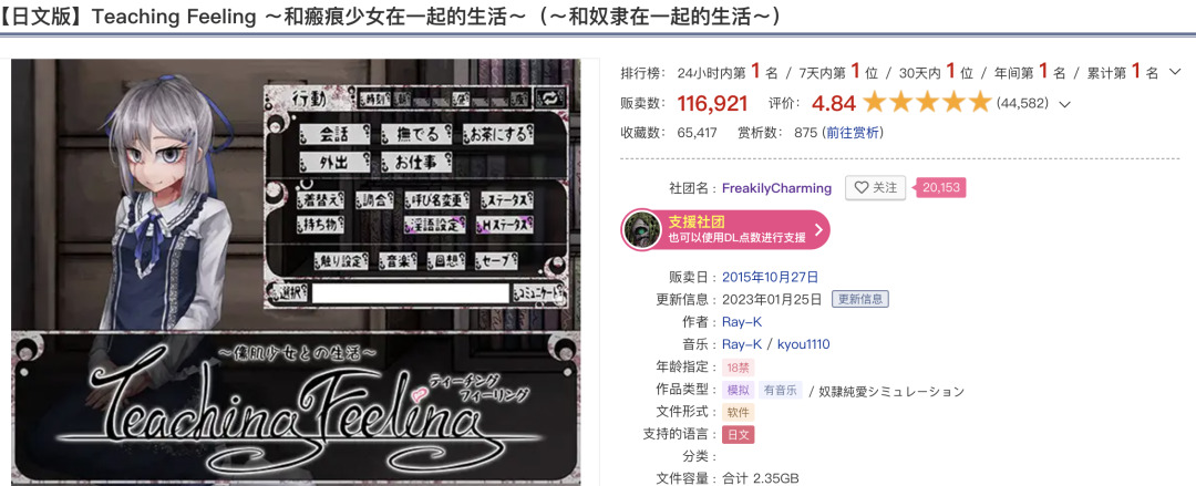 但就是这么一款看似简单的游戏,在 2015 年 10 月份发布后,很快就冲上了 DLsite 和 DMM ( 二者均为日本知名成人内容分发平台 )年度排名第一。