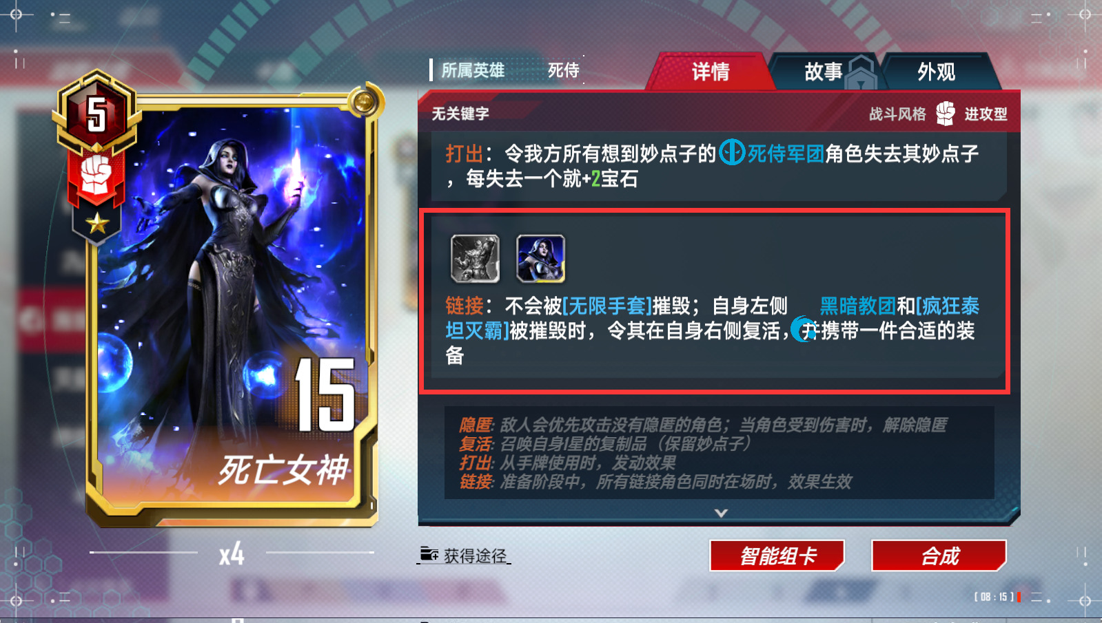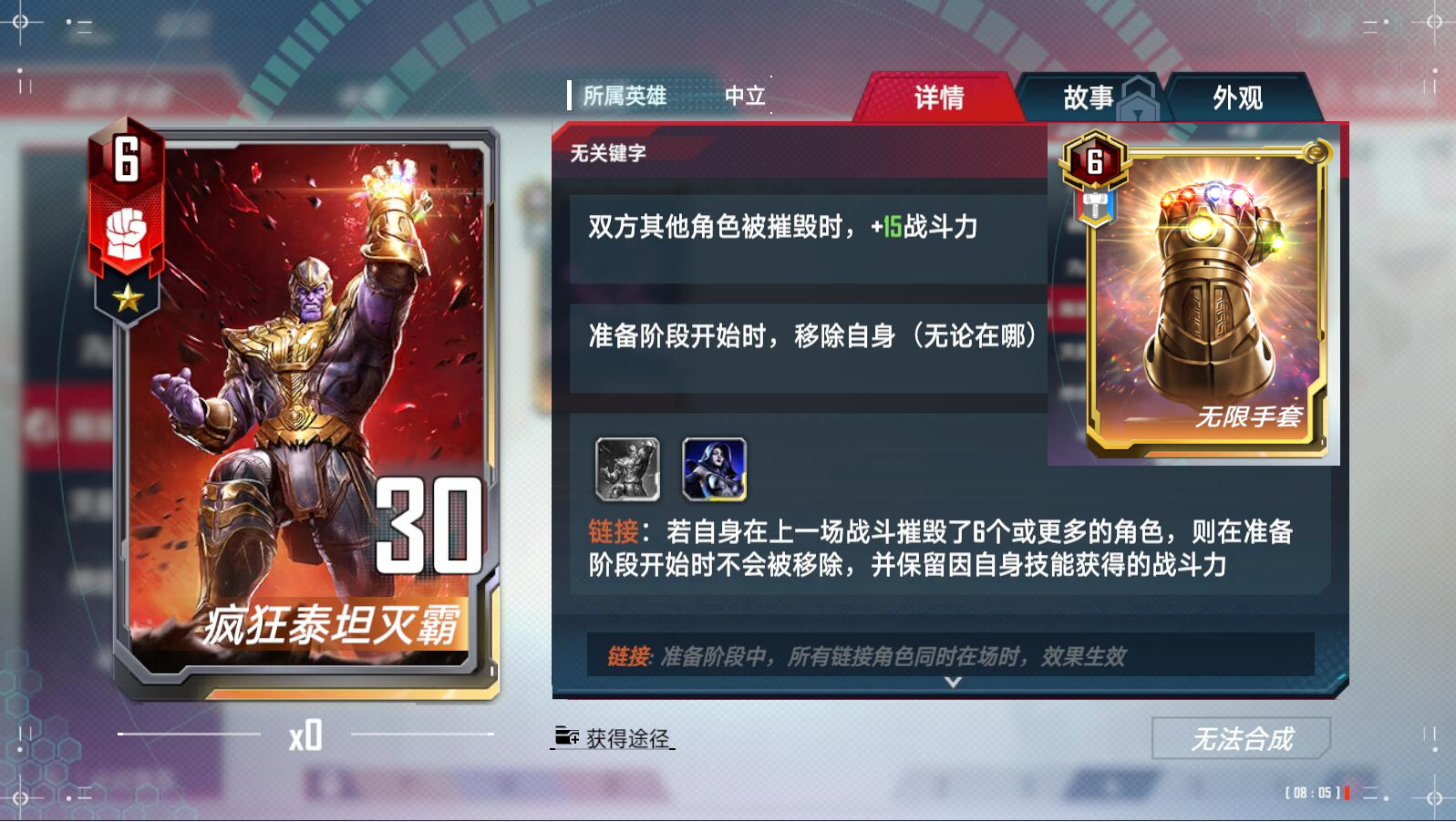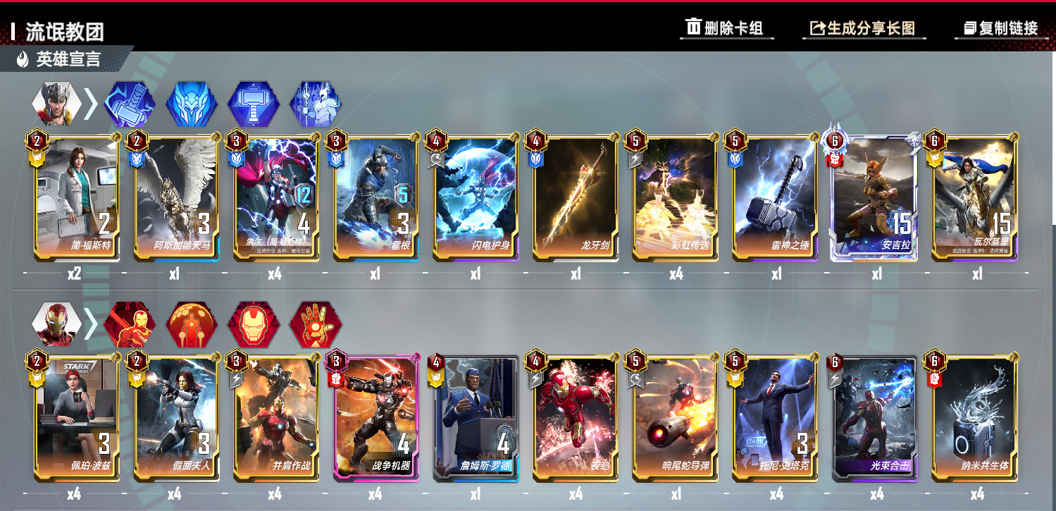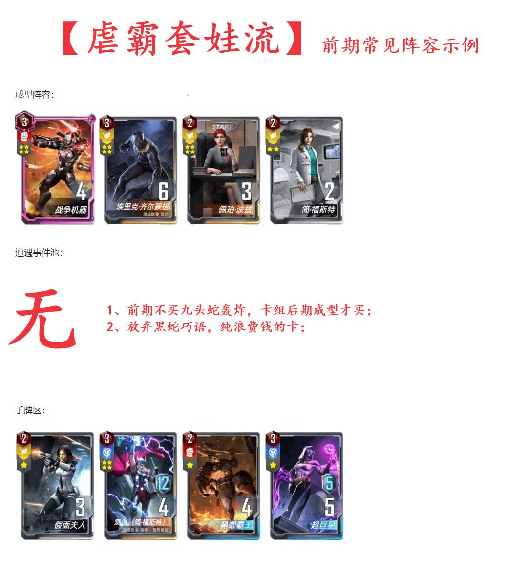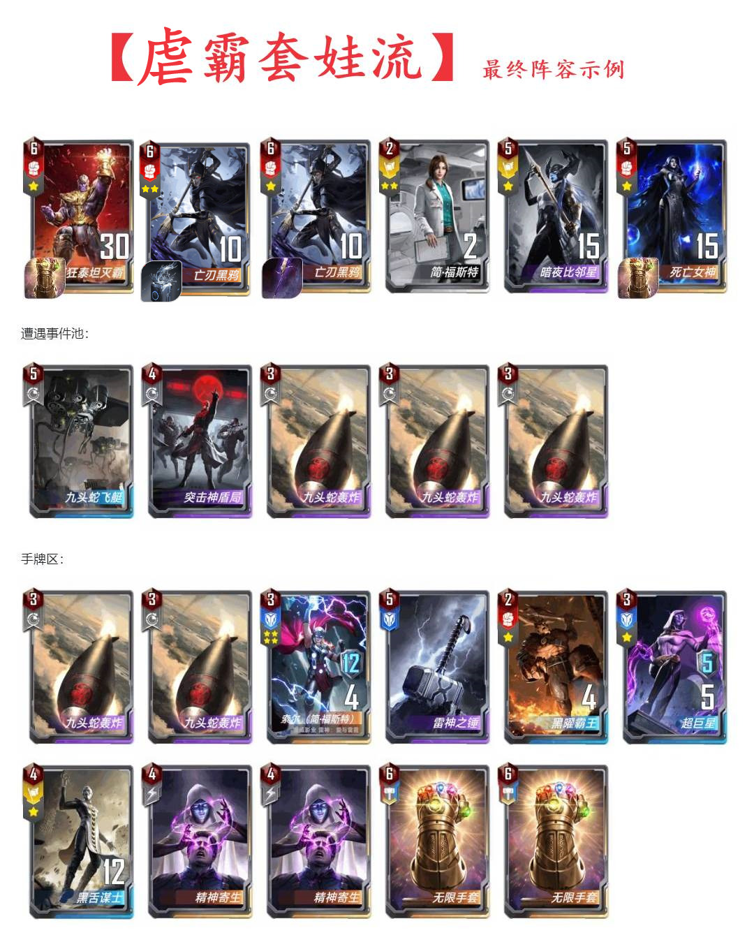 【灭霸套娃流】同样是这个游戏比较复杂的卡组之一,本卡组极致优化下限和上限,但需要大量的练习,但是成型后是非常爽的,大家有兴趣的可以组来玩玩。