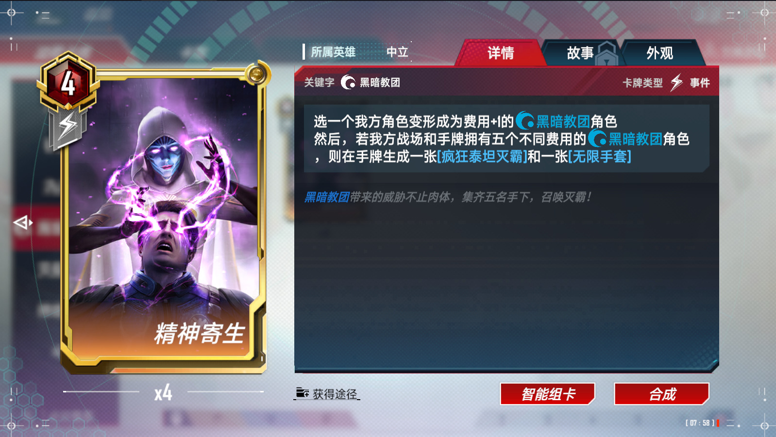 (二)、2-6费的教团各拿一张以后,对任意5/6费的角色卡使用精神寄生,或者,不用单独买其他卡,直接对黑鸦使用精神寄生,即可获得一张灭霸和手套