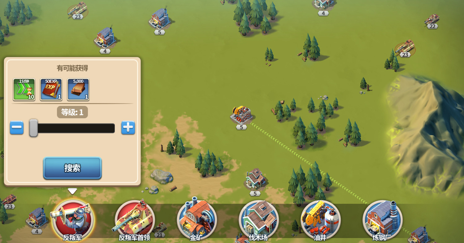在领地界面的左下角,点开“放大镜”形状的「搜索」按钮,我们可以搜寻金币、木材、石油、钢铁这些资源进行采集,也可以搜寻反叛军和反叛军首领进行挑战。