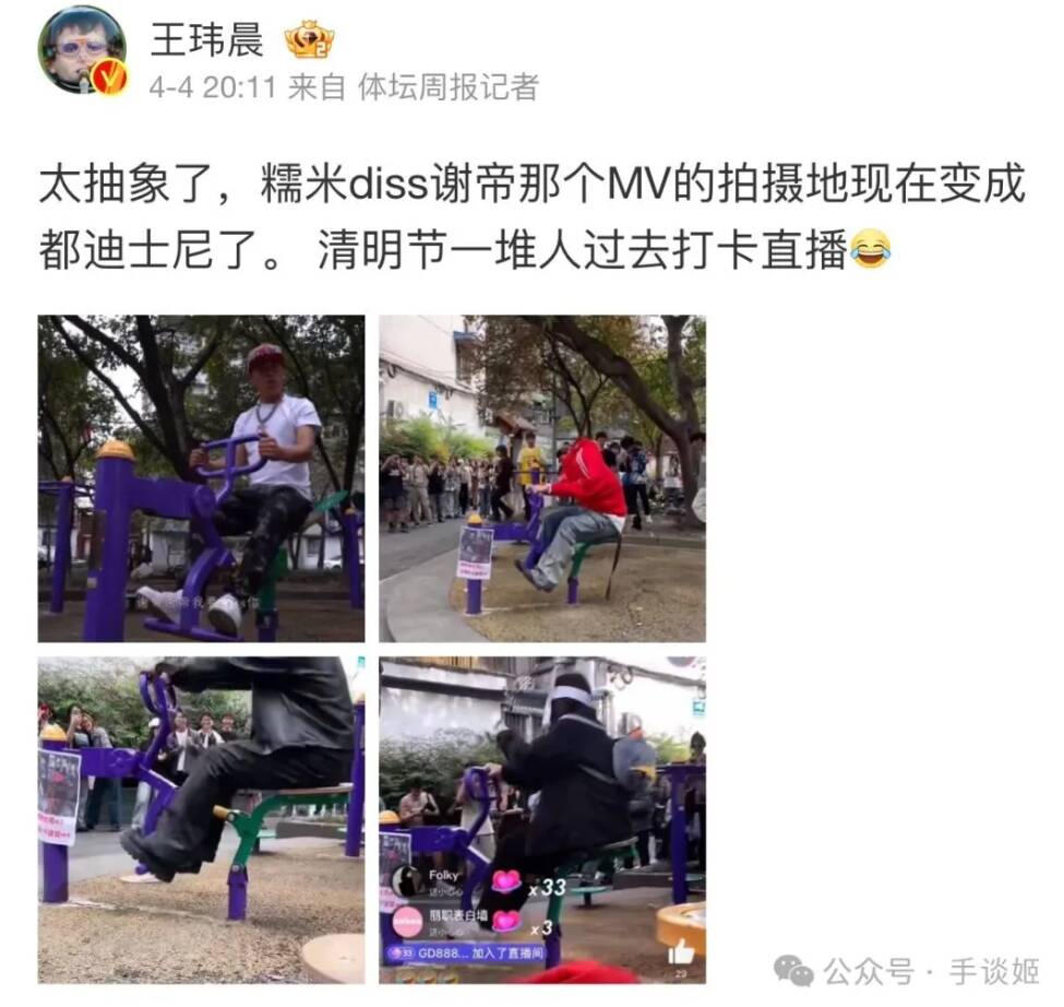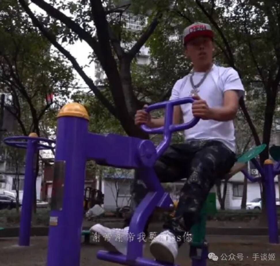 据说这首《谢天谢帝DISS》的mv在一些平台很火,“diss你”被听成了“迪士尼”,诺米在mv中在健身器材上摆pose的场景,也导致该小区的健身器材被冠以“成都迪士尼”的称号。