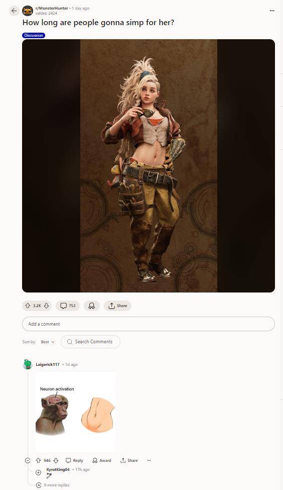 关于杰玛这位新角色的二次自然也少不了,甚至还有公开叫“老婆”的。不过最离谱的要数《怪物猎人:荒野》的Steam页面,拜杰玛热度所赐,游戏目前已经被玩家打上了“恋爱模拟”标签。