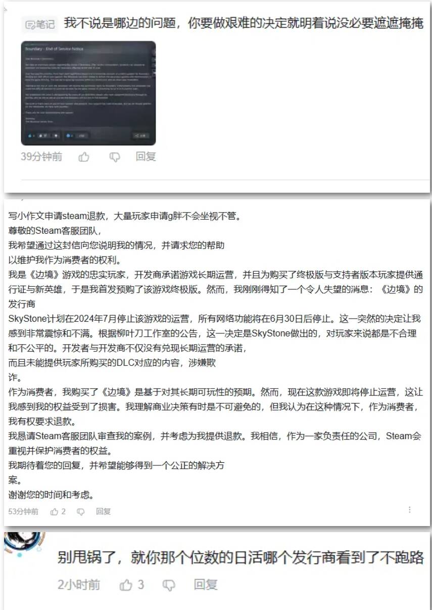 这明显是运营商和制作组互相甩锅,公说公有理婆说婆有理,但是玩家们可不管那么多,无论是谁的错,游戏要没了啊?他们纷纷去游戏底下打差评,如今《边境》的评测已经来到了“差评如潮”。
