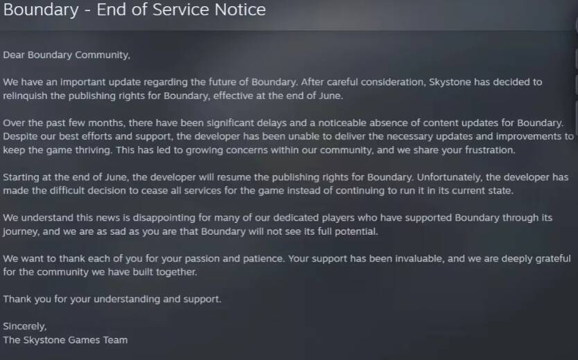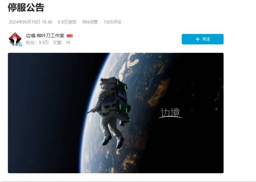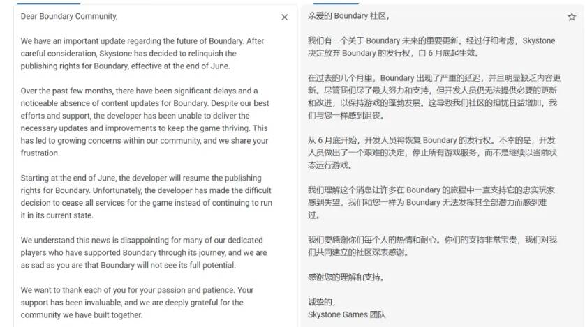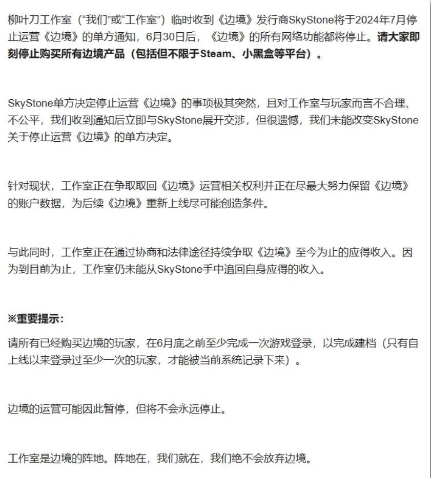 6月19日,柳叶刀官方B站账号发了动态,表示《边境》将于今年7月停服,停服是发行商SkyStone的单方面要求,且SkyStone方面欠钱了。