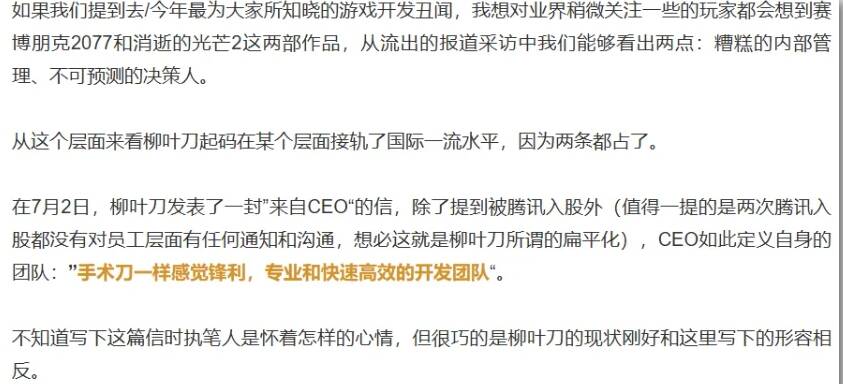 2021年的时候,柳叶刀工作室前员工“哥布林机车”在微博上爆料,称柳叶刀工作是内部管理糟糕、决策人不可预测,导致从成立开始到21年六年间没有任何的项目产出。