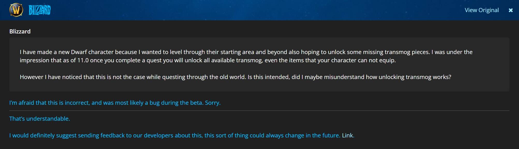 Q:我创建了一个新的矮人角色,因为我想在他们的起始区域及更远的地方进行升级,也希望解锁一些丢失的幻化碎片。我的印象是,从 11.0 开始,一旦你完成一个任务,你就会解锁所有可用的幻化,甚至是你的角色无法装备的物品。这是故意的,我是否误解了解锁幻化的原理?