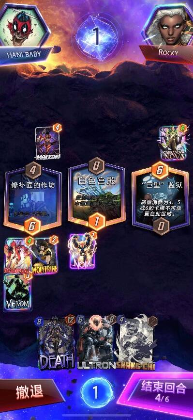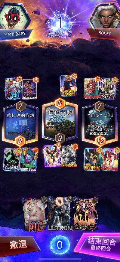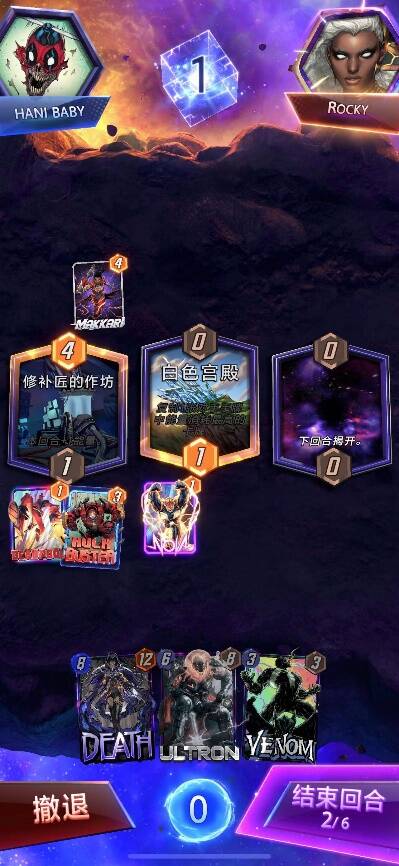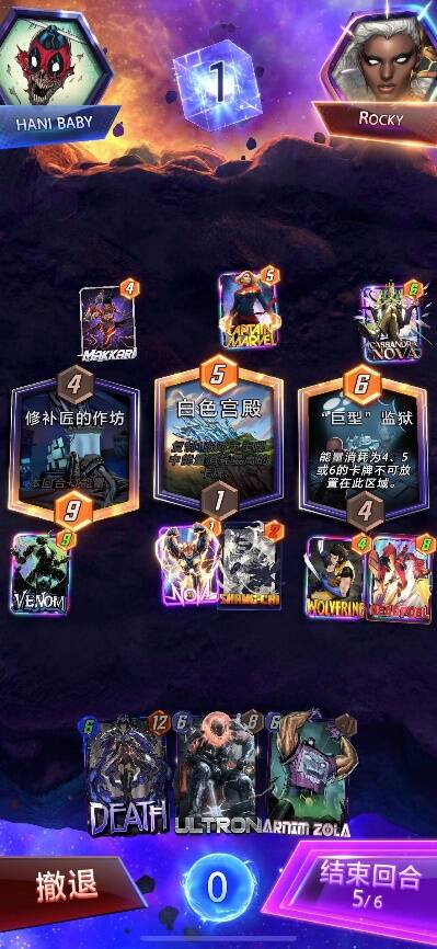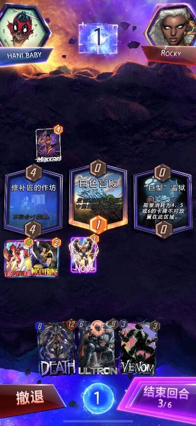 第三回合运气很差,只来了一张金刚狼,毒液我们捏在手里是不打的,计划5回合再打,只能在一路打下金刚狼。