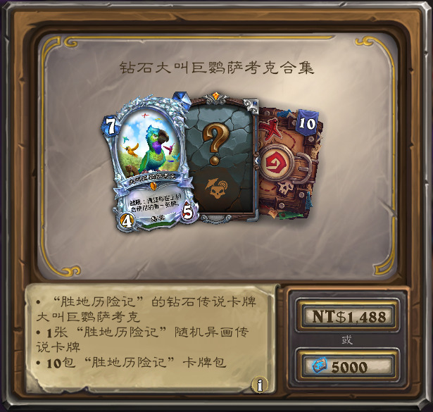 含构筑模式钻石大叫巨鹦萨考克,1张随机胜地异画橙,和10胜地包,售价5000符文石。