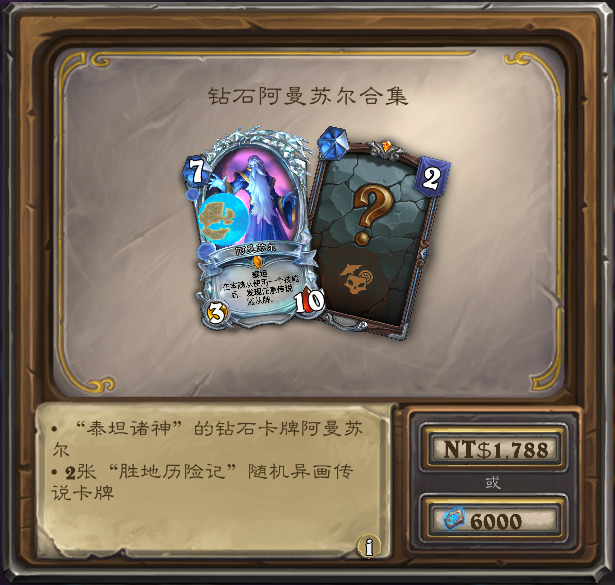 含构筑模式钻石阿曼苏尔,和2张随机胜地异画橙,售价6000符文石。