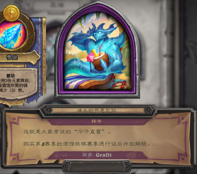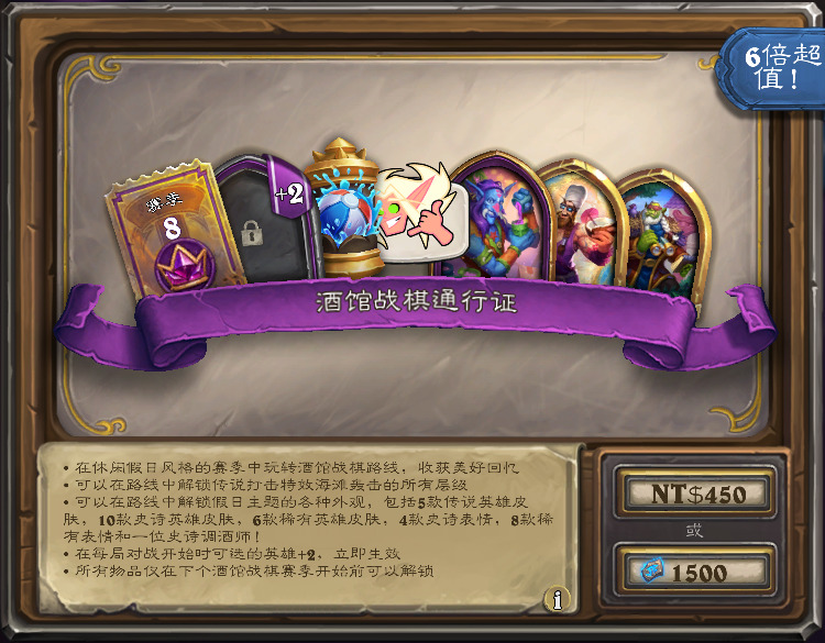 含战棋额外英雄选择,新的传说级的打击特效“海滩轰击”,新酒保“格里伏塔”,18款度假主题的英雄皮肤,和7款度假主题的表情(外观都只是解锁资格),售价1500符文石。
