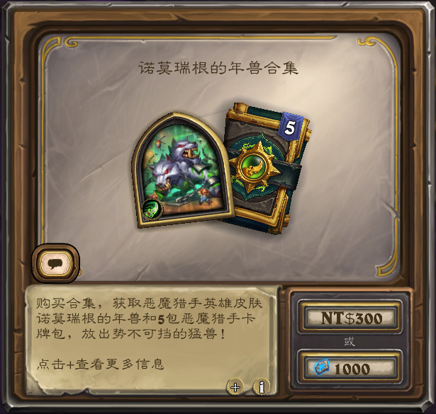 含构筑模式恶魔猎手新皮肤“诺莫瑞根的年兽”,和5恶魔猎手包,售价1000符文石。