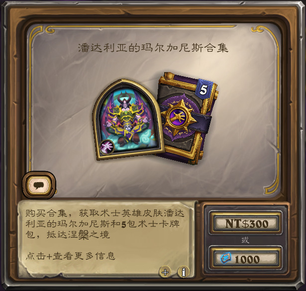 含构筑模式术士新皮肤“潘达利亚的玛尔加尼斯”,和5术士包,售价1000符文石。