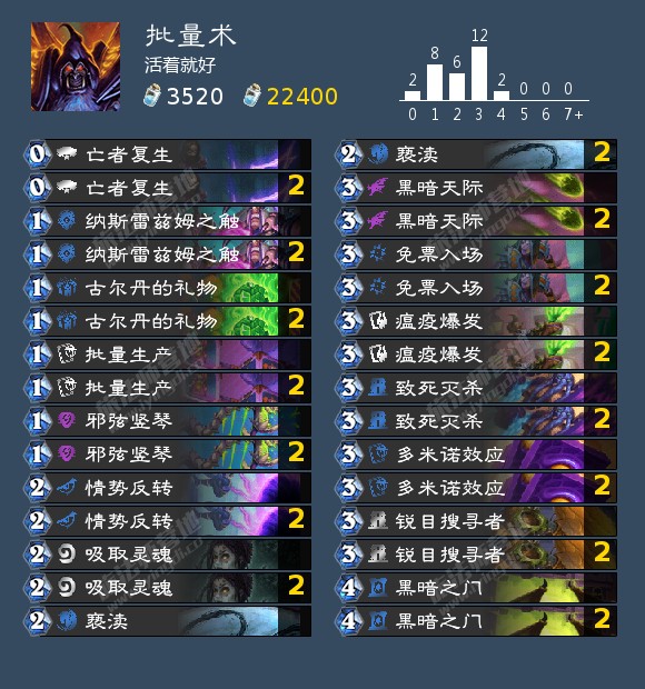 一次性成就,挺麻烦的。标准要做太浪费时间了,还是借助狂野的亡语体系加快效率。带上大量过牌和定向检索的卡,再加触发亡语的卡,卡组就成型了。