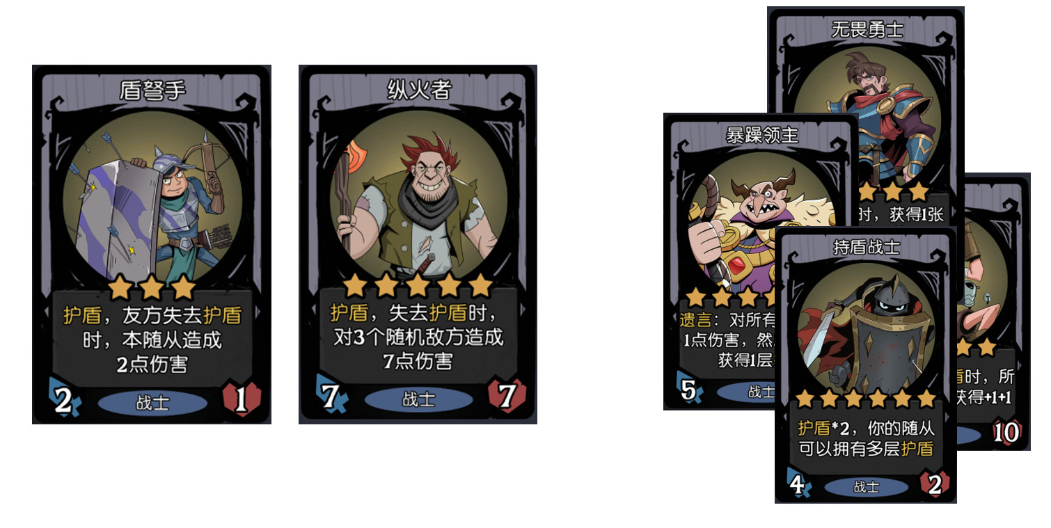 如果奇遇刷出了黄金茶匙,这一局的方向我们就可以尝试走盾战。但盾战前期比较好的过度方式似乎只有养一个增伤高点的盾弩手然后每回合复制。当然,其实这些都不是关键,前期也可以用其他阵容(前文提到的那些阵容)过度,不一定非要从头到脚都是玩盾战。因为盾战的很多核心卡其实集中在高本,无论是输出的主力纵火者(其实有暴躁领主的时候盾弩手也可以是主力),还是能够稳定每回合叠盾的无畏勇士等等随从,他们有一个非常致命的问题,那就是都在高本,所以玩盾战可以不用那么着急。