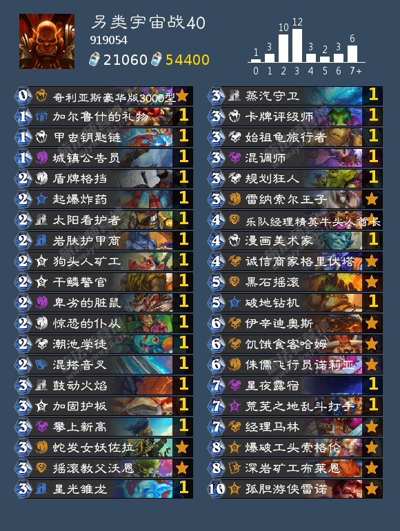 40宇宙战,说下致胜点,6费石头人,还有发掘的牛牛,摇滚教父可以复制2个致胜卡,牛牛里塞的新高,乱斗以及130,没有把石头人和娜迦放里面的原因是新高太重要了,不升费,玩不动,手牌会卡死,2费警官复制法术,卡组去掉了很多低质量法术,带了黑石摇滚,3费娜迦定向还有规划达人找牌,起手留牌就找新高,然后低费的看情况留就好,喜欢控制卡组的可以试试,和常规宇宙战区别还是很大的。