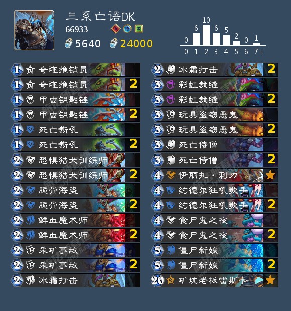 提供了一种思路,感觉很有意思,就抄起来用。实战打下来后发现有些卡手,摸不到伊丽扎或者老板就只能期待玩具盗窃恶鬼发现有用的亡语,不然就g了。对战的时候遇到同行,那个老哥带了5费佛丁检索老板,给我一些思路,就是提高核心牌的上手率,把一些不关键的牌去掉,带足了发现,摸不到伊丽扎和老板可以找。优化构筑后是3号,因为想着要为新版本存任务,就开始用小号打。