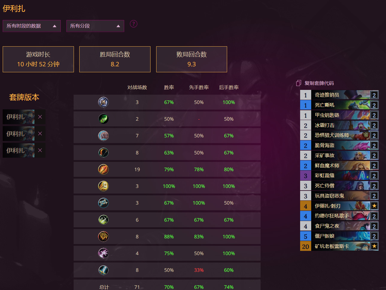 这三天打下来感觉不错,打很多职业都是优势。小号上个月没怎么玩,结算是黄金,没有多少加星,然后电脑上70把70胜率,手机上大概10把左右,总共80把70%胜率打到钻5,。打战士胜率低一是因为被130搞了,打德和战牧一定要防130!一定要防130!一定要防130!做复生伊利扎的时候一定注意,做出来已经优势很大了,防130把伊丽扎送掉。一开始没留意吃了几次亏后打战士我甚至会冰霜杀掉伊丽扎。